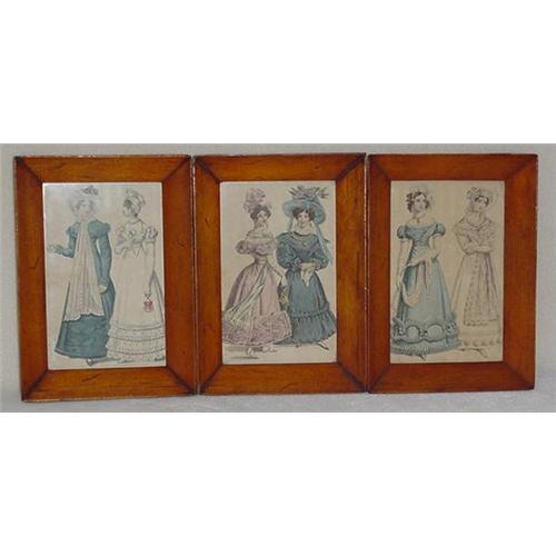 Three framed engravings, 5" X 7 1/4", of women in 18th century dress. Charmingly framed in deep honey colored wood frames, probably in the early 20th century. The original engraving are of the 18th century and in good condition. A charming threesome will add a decorative touch to any room. (5)