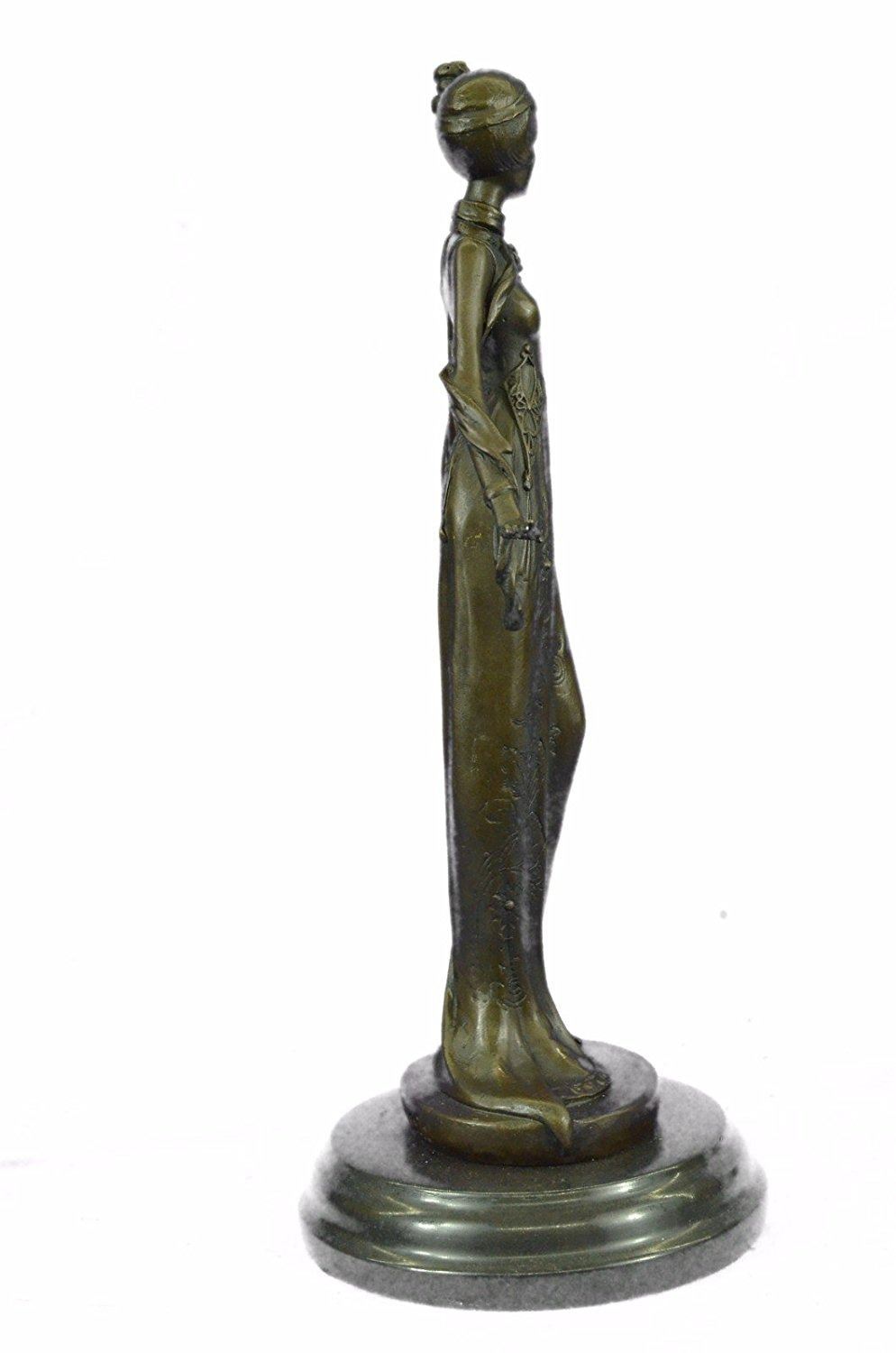 The Young Lady Gazes Into sky. The Look In Her Eyes Hints That It Might Be A Gift From Admirer. She Is Dressed In A Simple Long Gown That Clings To Her Figure. She Clutches The Fabric With Her Other Hand So It Raises A Little From The Hold. This Beautiful Sculpture Was Crafted Using The Lost Wax Method. It Is Mounted On A Black Marble Base. Bronze Dimensions with Marble Base: Height 13 X Width 5 inches. Weight: 6 LBS. Inventory: 24YRD12993542