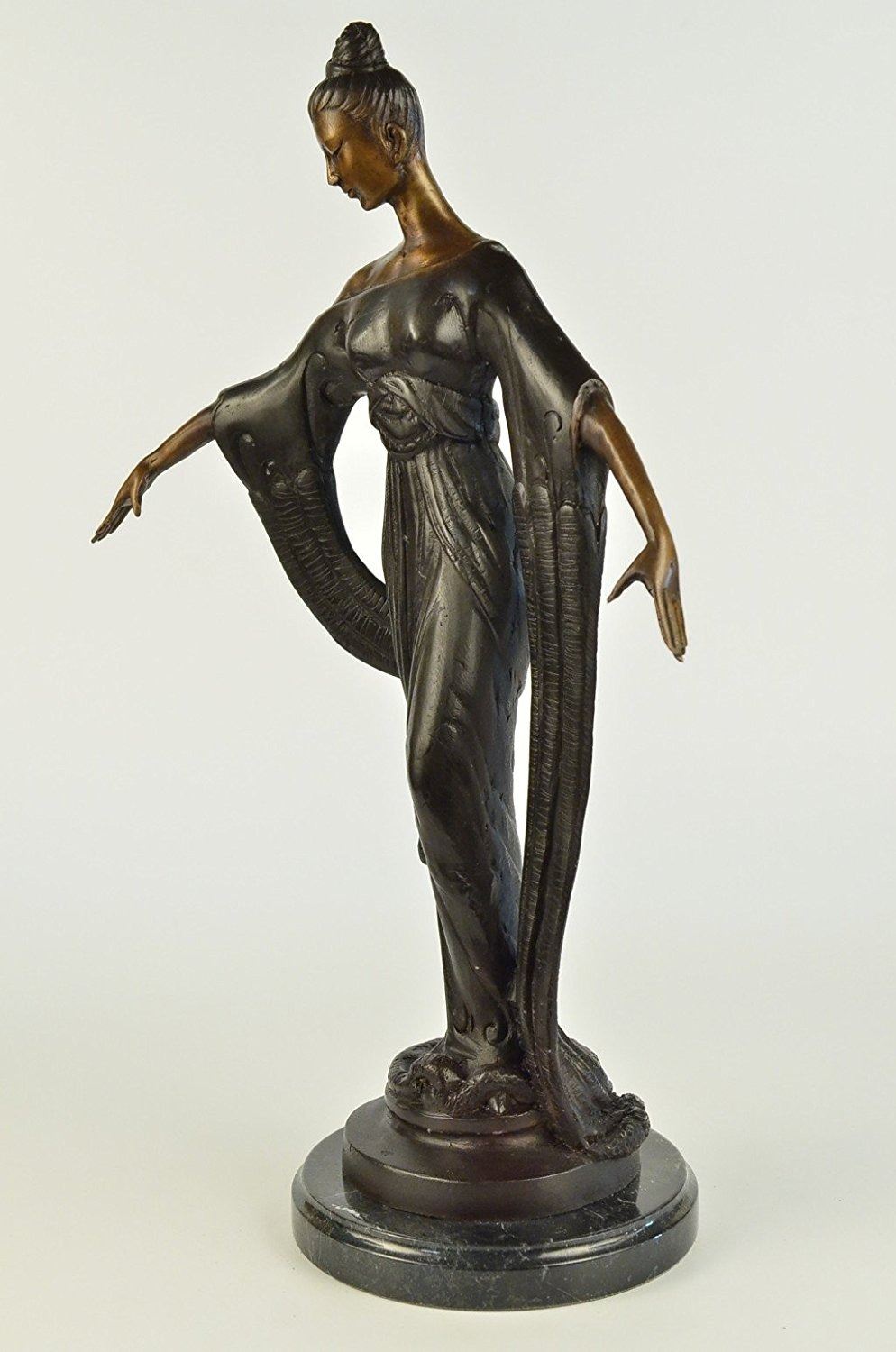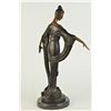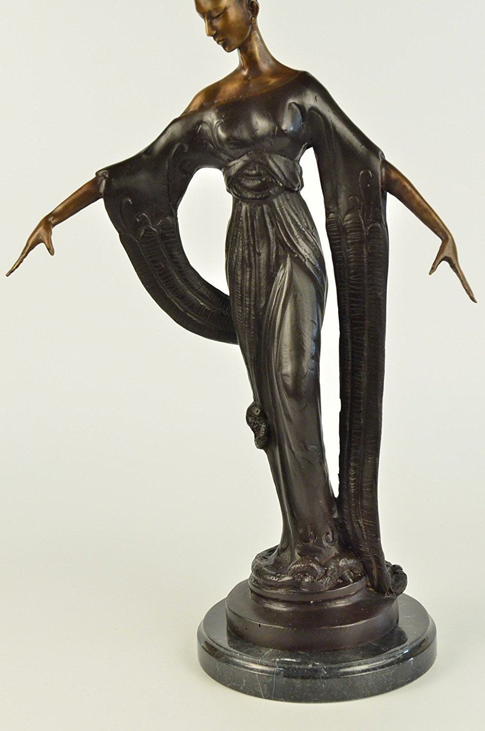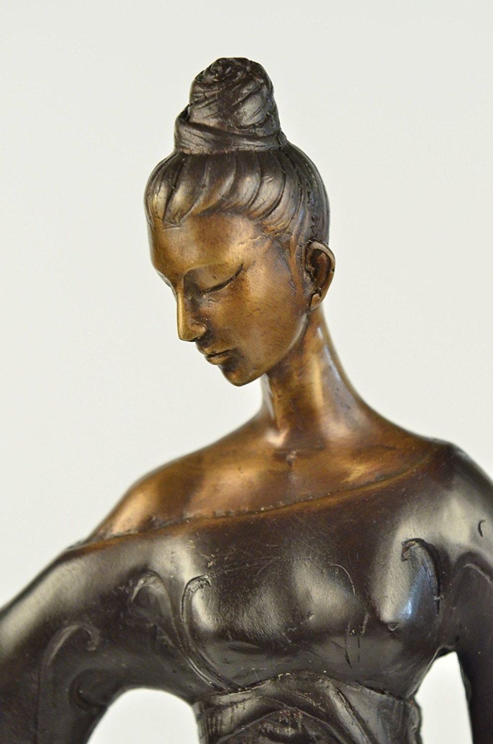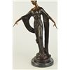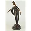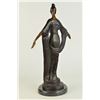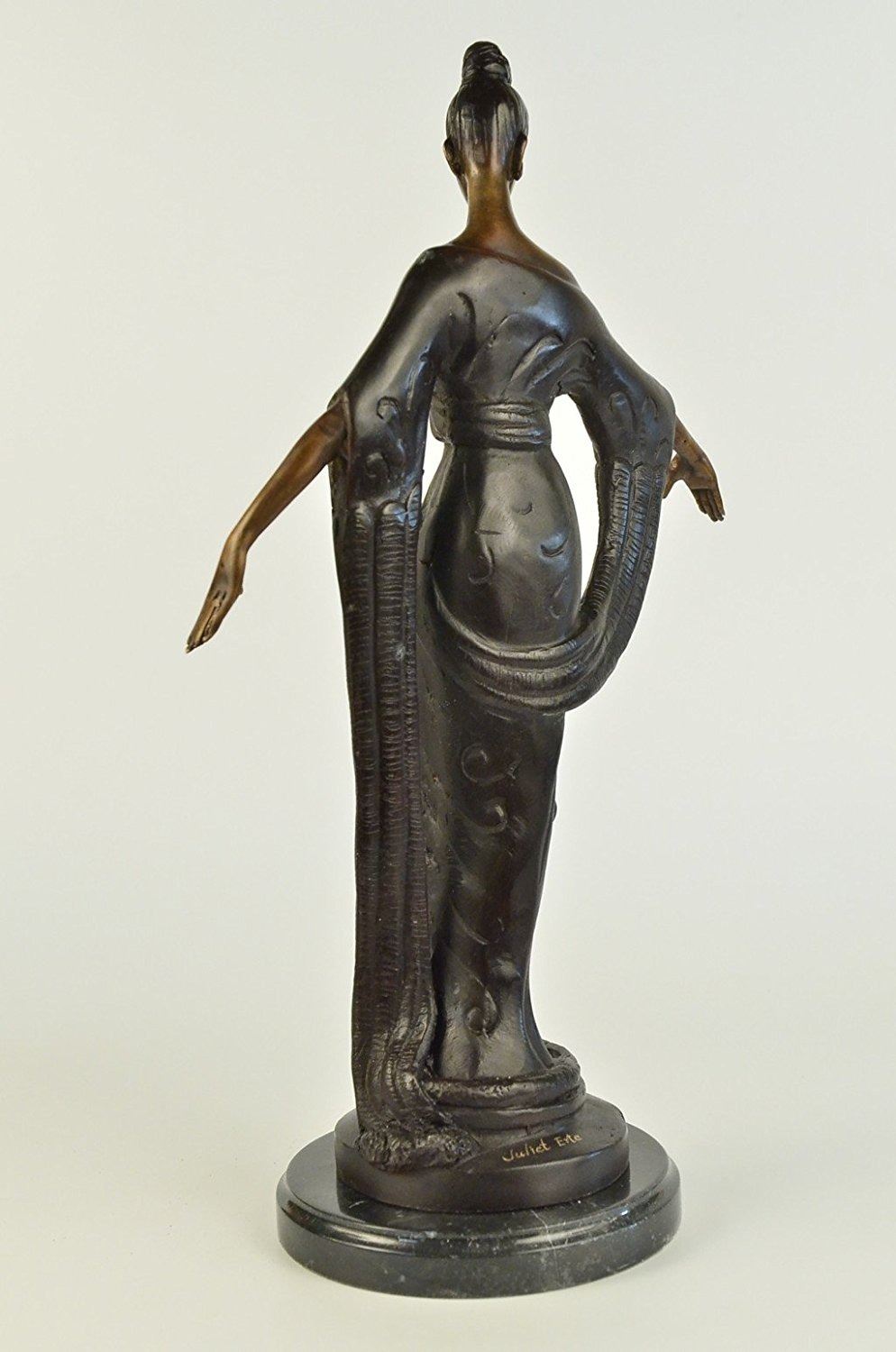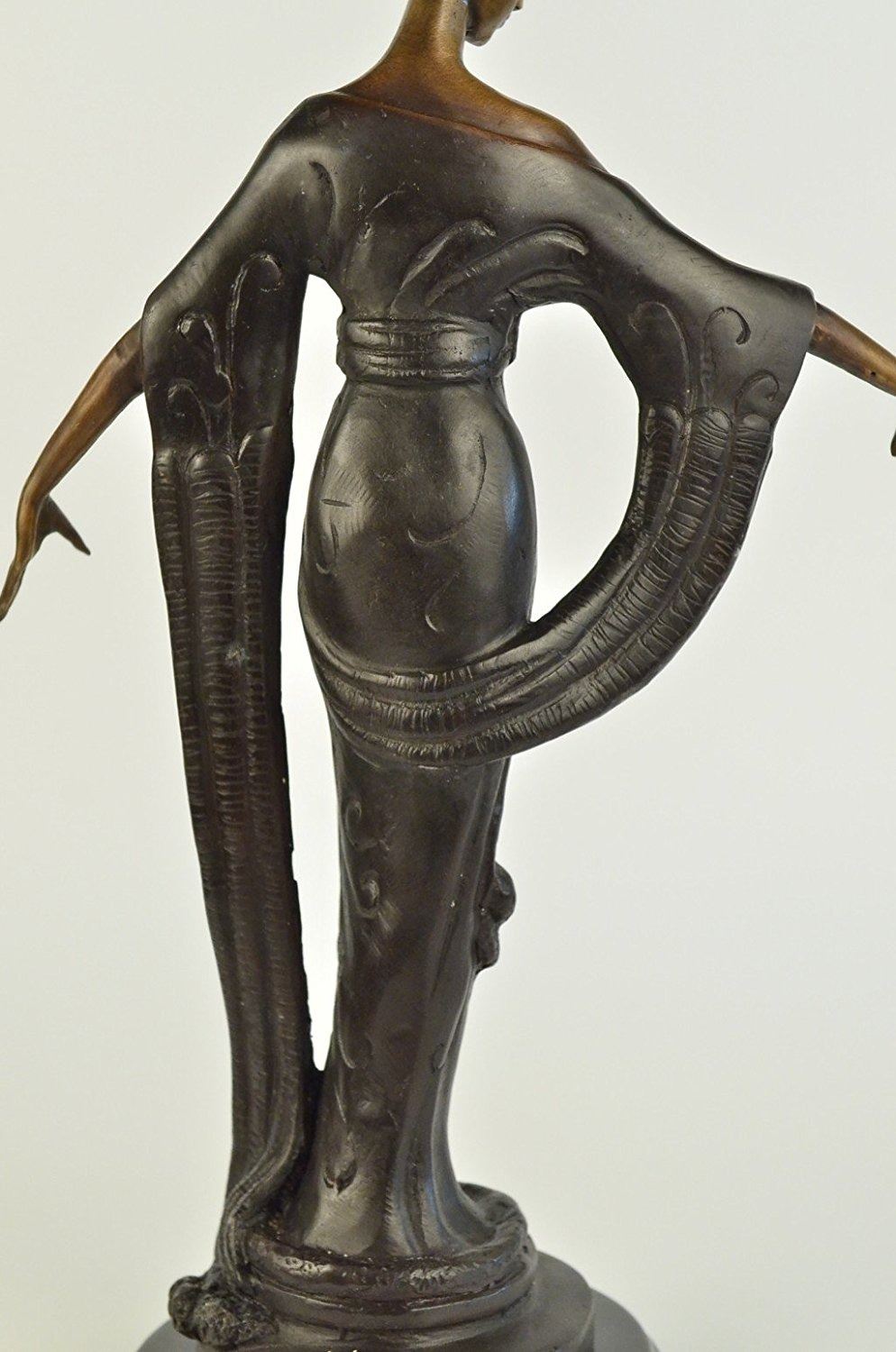 This unique sculpture of a 1920's woman is a beautiful piece for an exquisite living room or a young lady's bedroom. As she stands elegantly for her photoshoot, who can forget to mention her unforgettable dress that drops all the way to the floor, while she holds an umbrella under her right arm. The details on her neckless,waist belt, over coat, and her Charleston hat, are unbelievably carved leaving her picture perfected. This is a beautiful bronze sculpture cast using the Lost Wax Method and has a gorgeous brown patina. It is mounted on a marble base. Bronze Dimensions with Marble Base: Height 19 X Width 11 inches. Weight: 12 LBS. Inventory: 5057948M9005
