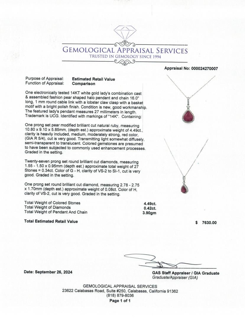 A 14KT white gold pear-shaped halo pendant and 16-inch chain with a basket motif, showcasing a 4.49ct natural ruby with a medium-dark red hue. Surrounded by 0.42ct of round brilliant cut diamonds, graded VS-2 to SI-1 clarity. The pendant measures 27mm in length and features a lobster claw clasp.