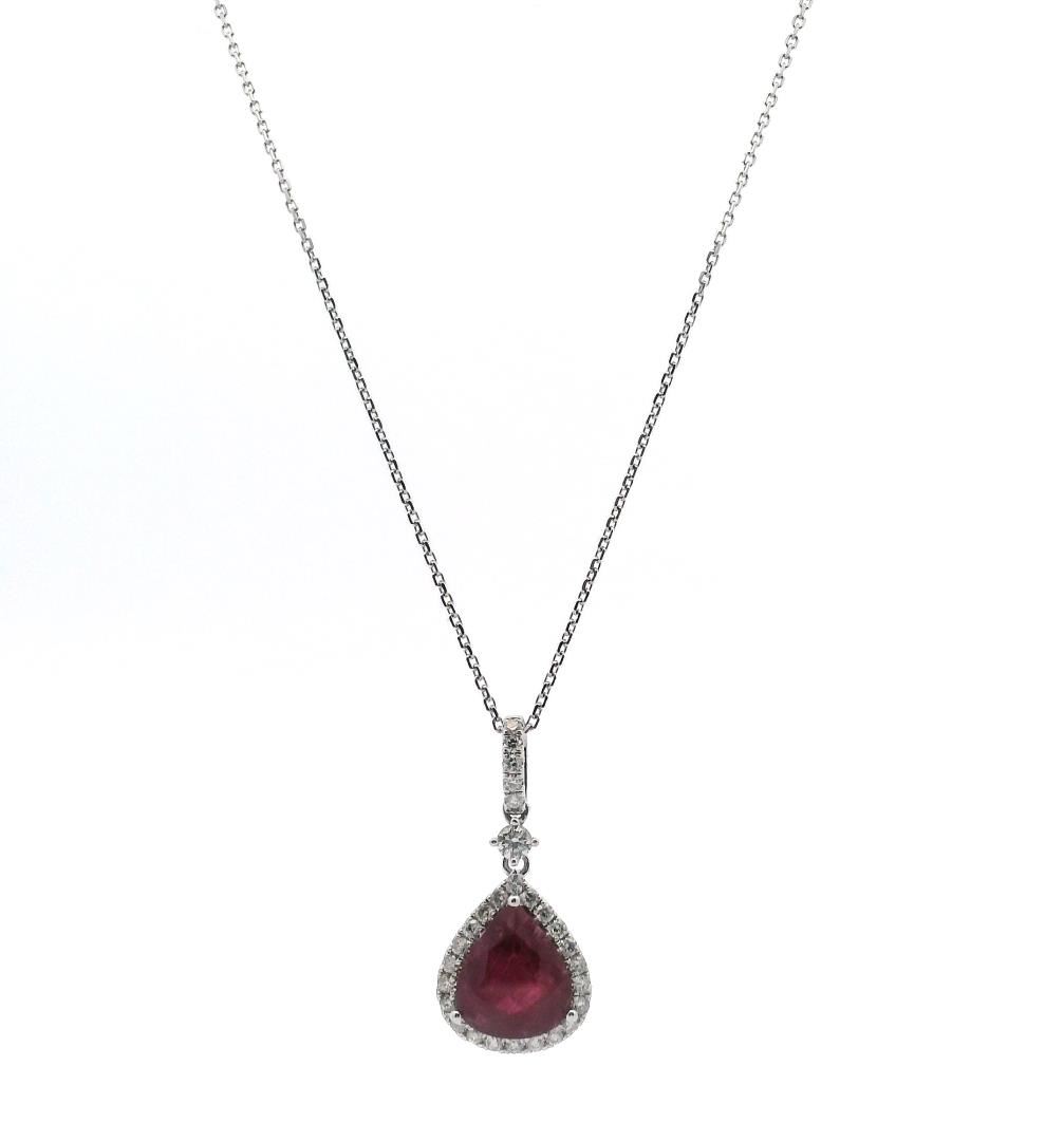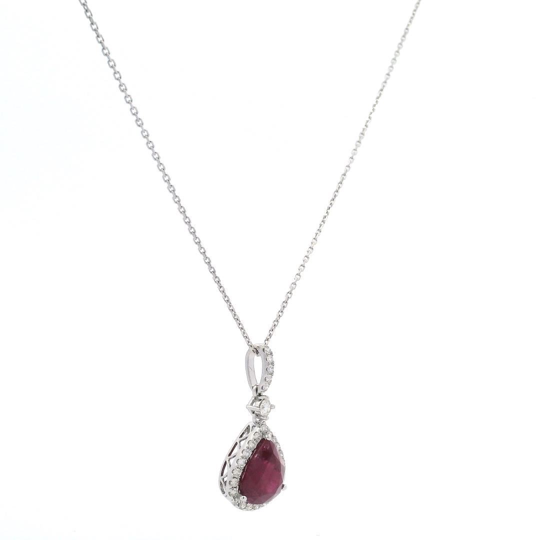 A 14KT white gold pear-shaped halo pendant and 16-inch chain with a basket motif, showcasing a 4.49ct natural ruby with a medium-dark red hue. Surrounded by 0.42ct of round brilliant cut diamonds, graded VS-2 to SI-1 clarity. The pendant measures 27mm in length and features a lobster claw clasp.