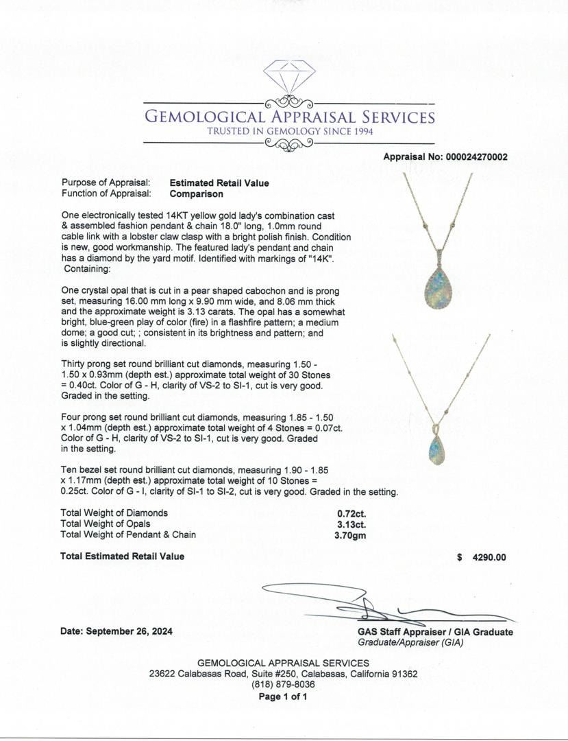 This 14KT yellow gold pendant features a 3.13ct pear-shaped cabochon-cut crystal opal with a bright blue-green play-of-color in a flashfire pattern. It is accented by thirty prong-set round diamonds totaling 0.40ct, four additional diamonds totaling 0.07ct, and ten bezel-set diamonds totaling 0.25ct. The diamonds are G-H color, VS-2 to SI-1 clarity, with a very good cut. The total weight of the pendant and chain is 3.70 grams.
