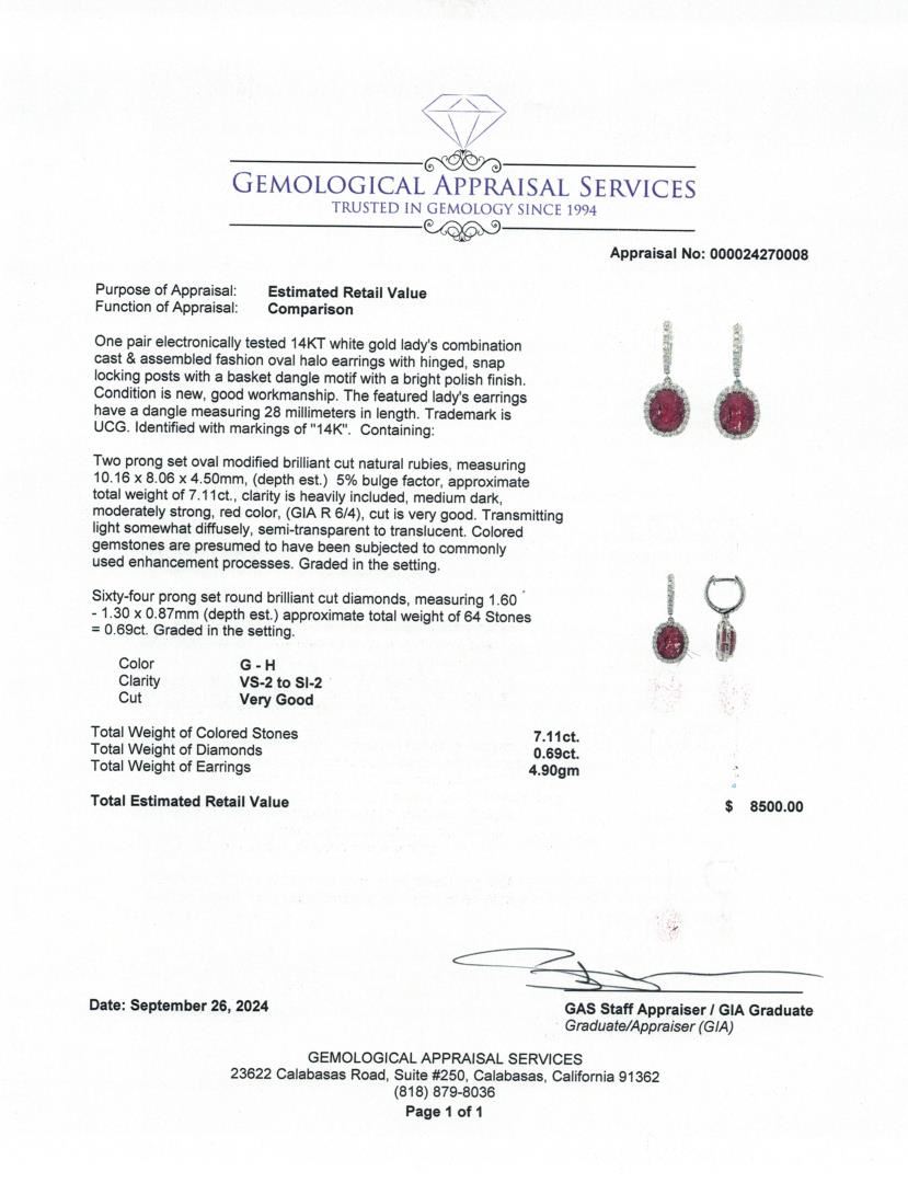 A pair of 14KT white gold halo dangle earrings featuring two oval natural rubies totaling 7.11ct. The earrings, measuring 28mm in length, are surrounded by 0.69ct of round brilliant cut diamonds with VS-2 to SI-2 clarity. Secured with hinged snap-locking posts.