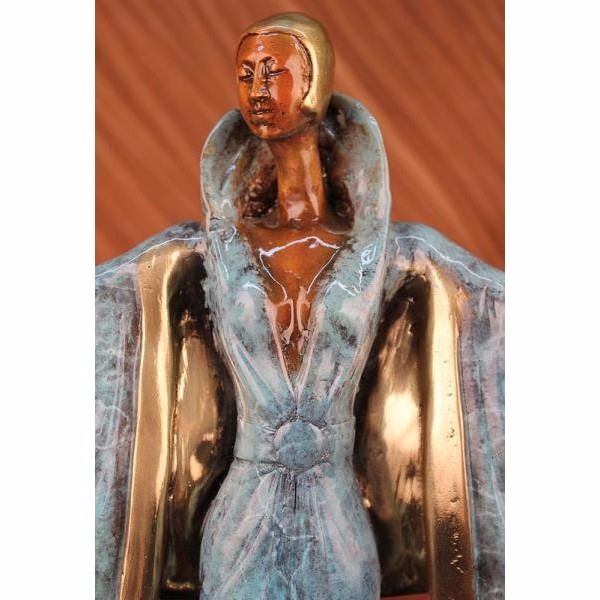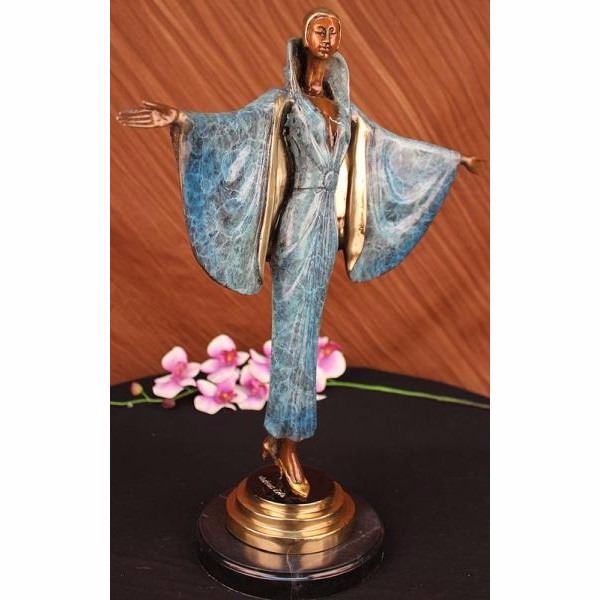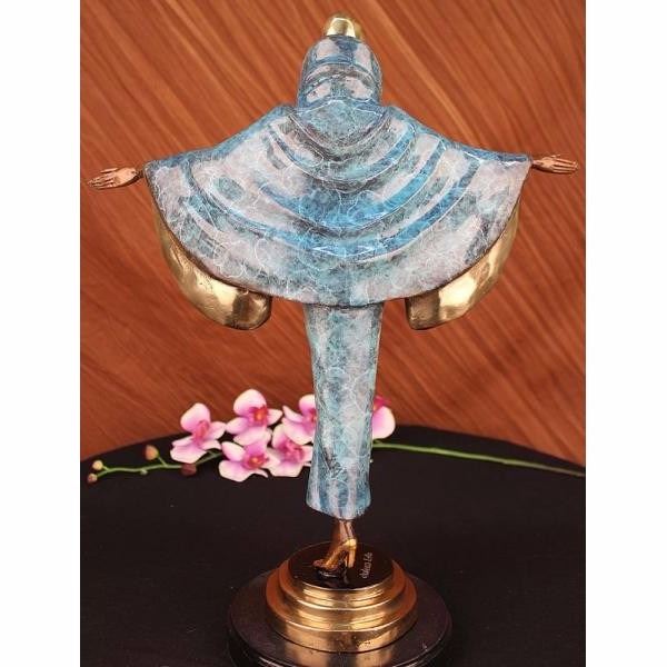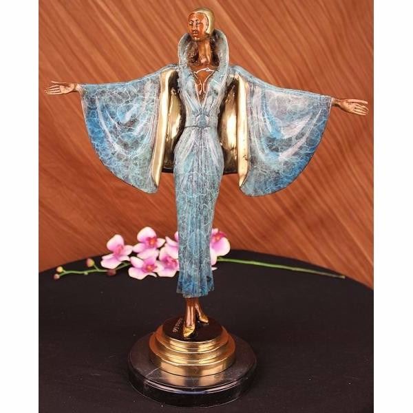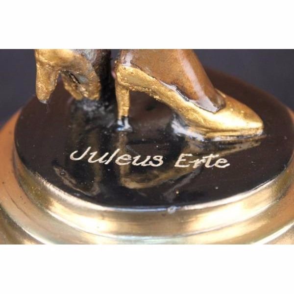 She stands at the end of the runway. The camera bulbs flash as she spreads her arms to showcase her fashion forward outfit. She wears a long golden brown patina dress that cinches into her narrow waistline. The collar of the vintage dress is high, bringing back the days of old Hollywood. A black shawl is draped over her shoulders. The rich patina of the shawl gives it the appearance of ripples from movement. She shuts her eyes and basks in the attention and glamour of center stage. This fashionista is 100% bronze and handmade. She was cast using the "Lost Wax Method" and mounted on a marble base and is signed Juleus Erte. Condition: This sculpture is in perfect condition. Bronze Dimensions with Marble Base:Height 19" x Width 15" Marble Dimensions: Diameter 7" Height without base: 18" Weight : 15 LBS Inventory 67-57634NA8876