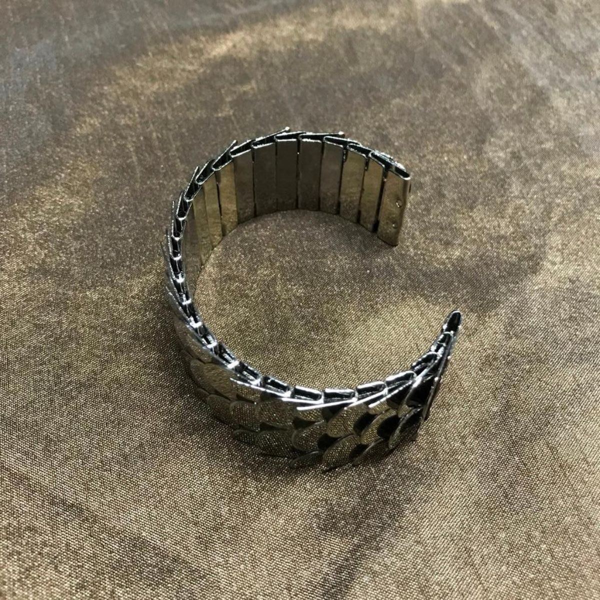 Modern fashion runway-style "Modern Viking" gunmetal-tone fish scale cuff bracelet. 2" X 2 1/2".