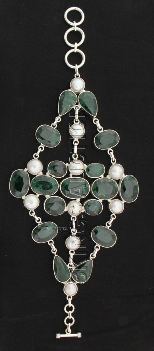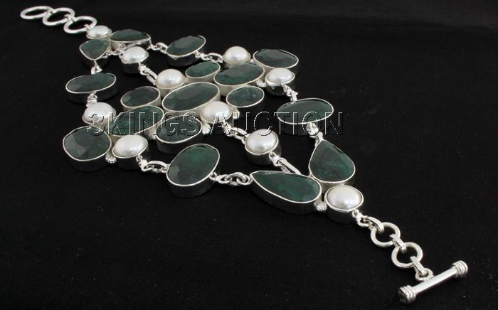 Fashion Silver 395.50ctw Emerald Beryl Bracelet **|**|** Heavy Cut Handmade Silver Bracelet with Natural Emerald Gemstone and Pearls size: 8.5 inches; color: Green; Stone Family: Beryl ; MSRP: $4400