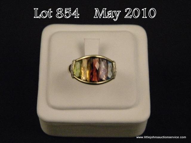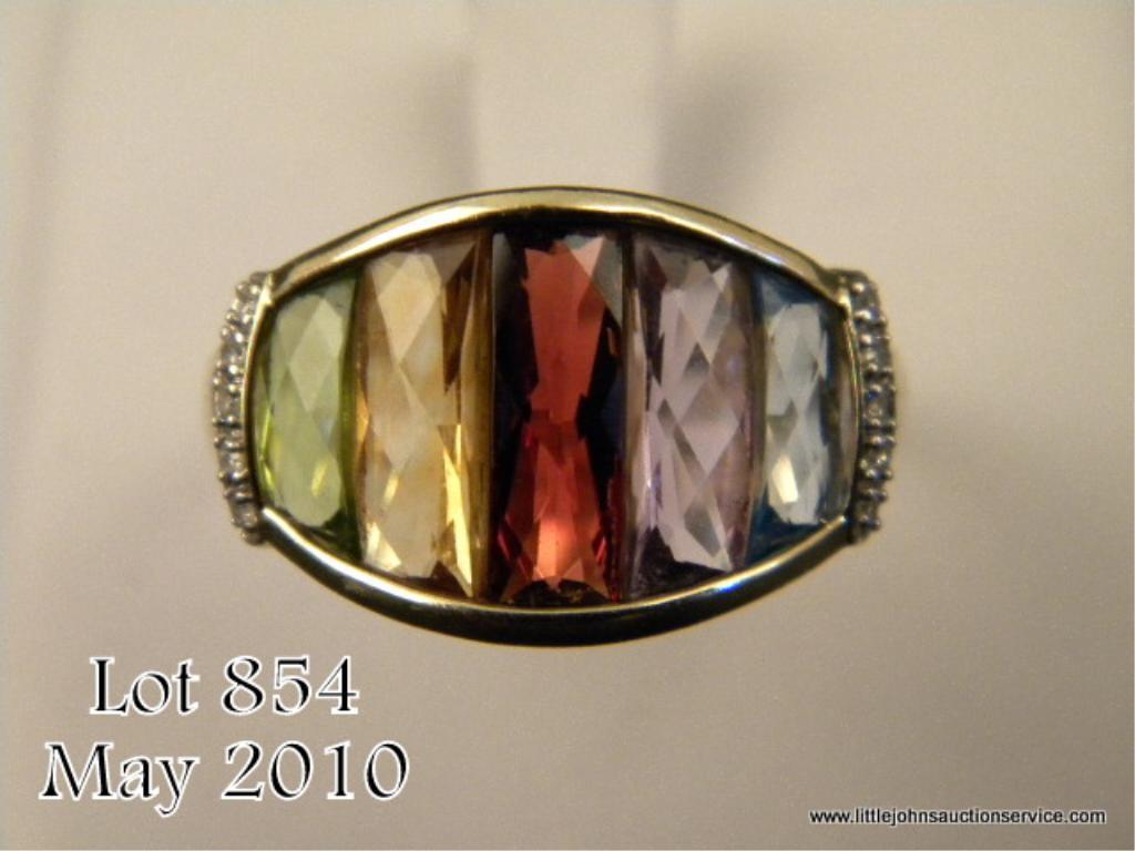 Fashionable 10 karat yellow gold ladies handmade ring set with 5 custom cut garnet, amethyst, citrine, peridot and blue topaz weighing approx. 4.00 carats and side pave set diamonds. Retail $995.00 Estimate $300-$400 A nice item