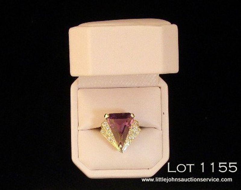 Fashionable 14 karat yellow gold ladies ring set with a fine center custom cut amethyst weighing approx. 5.00 carats and pave set with side diamonds weighing approx. 0.30 carats of G-H color and SI clarity. Retail $2,950. Estimate$600-$800. Featured item.