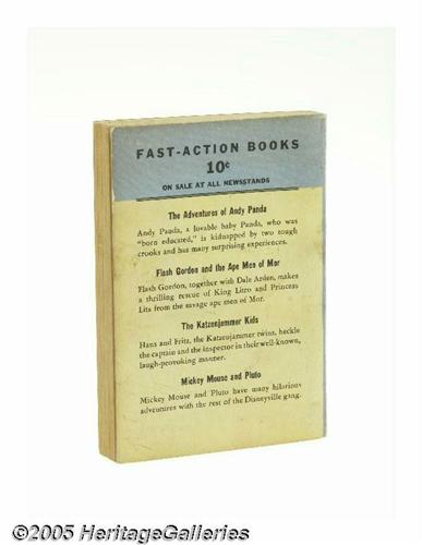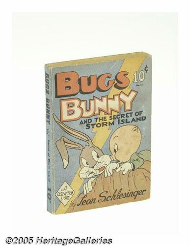 <B>Fast-Action Story #13 Bugs Bunny and the Secret of Storm Island (Dell, 1942) Condition: FN-.</B></I> Featuring slightly different dimensions than a standard Big Little Book (but with the same format), the first four <I>Fast-Action</B></I> books were released in 1936 (hardback editions called <I>Cartoon Story Books</B></I> and softcovered editions noted as <I>Fast-Action Stories</B></I>. Whitman then continued the line from 1938-1943. With much smaller print runs than Big Little Books, all volumes are considerably more difficult to find and avid collectors often spend years trying to located individual titles. The soft-covered format -- unlike the hard covered Big Little Books -- adds to the difficulty in locating nice copies. The Larry Jacobs Collection includes a number of choice titles. Many collectors will tell you that the <I>Fast-Action</B></I> volumes containing non-Disney characters are the most difficult to locate. This Bugs Bunny selection is a good one. Its binding is tight, and its interior paper quality is surprisingly nice with some scuffing/light cover wear. A nice addition to your library! Overstreet 2005 FN value = $90. <I>From the Larry Jacobs Collection.</B></I>