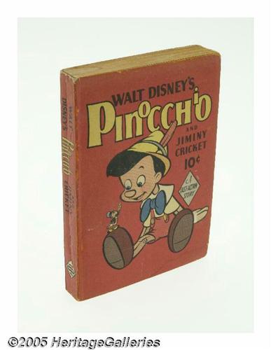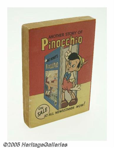 <B>Fast-Action Story #1435 Walt Disney's Pinocchio and Jiminy Cricket (Dell, 1940) Condition: Apparent FN.</B></I> Generally classified with Big Little Books, offered here is a solid copy of the scarce Dell <I>Fast-Action Story</B></I> of <B>Pinocchio and Jiminy Cricket</B></I>. Produced in 1940, it measures 4" x 5.5". It is complete; interior paper quality is pretty decent -- shows aging, but still supple. Binding is tight; no writing. There is a small moisture mark at bottom right of front cover, smaller one on top edge of book; apparent grade is due to color touch along portions of edges/spine. Overstreet 2005 FN value = $60. <I>From the Larry Jacobs Collection.</B></I>