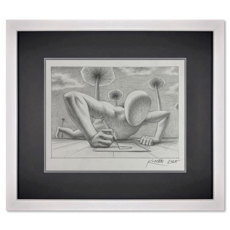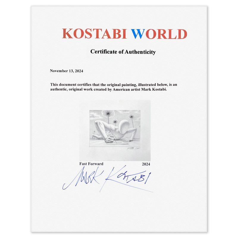 "Fast Forward - New York" is an original drawing on paper by Mark Kostabi, hand signed by the artist. This piece comes custom framed. Includes Certificate of Authenticity. Measures approx. 13.5" x 15" (frame), 7.5" x 9" (image). This item requires special handling and may have a longer than usual turnaround.