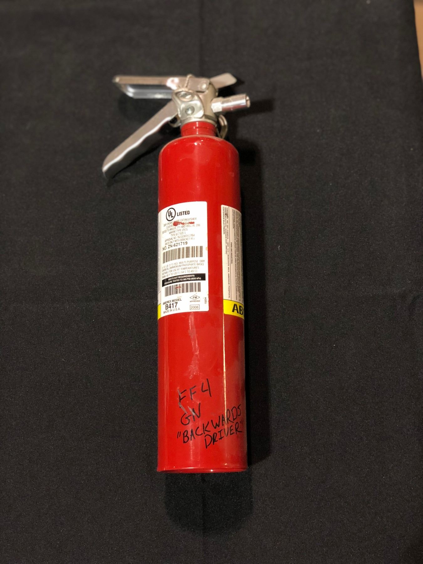 Original screen used fire extinguisher used in Dominic Toretto's (played by Vin Diesel) car as he's driving backwards. From the Justin Lin directed action film "Fast Furious" (2009), where Brian O'Conner, back working for the FBI in Los Angeles, teams up with Dominic Toretto to bring down a heroin importer by infiltrating his operation. Starring Bruce Willis, Billy Bob Thornton, Ben Affleck and Liv Tyler.