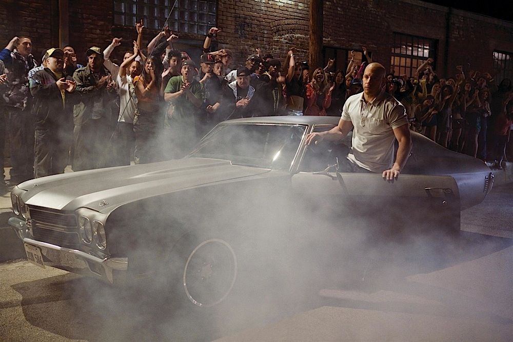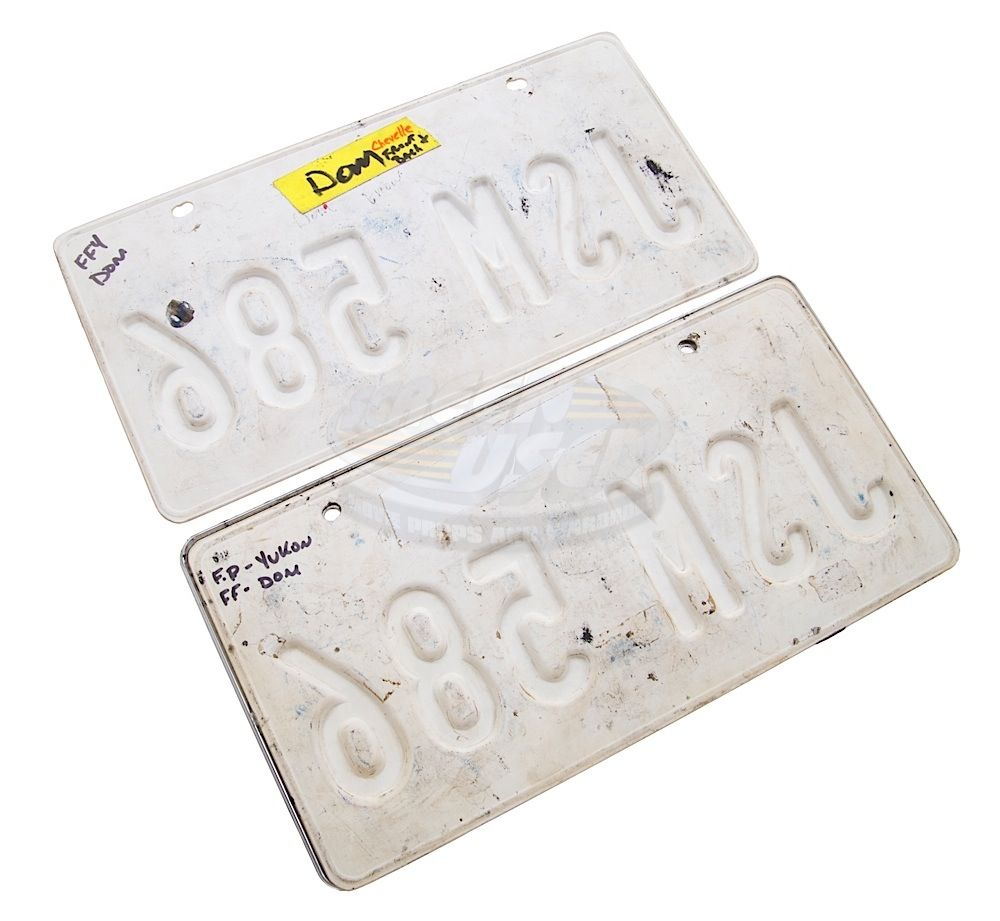 (Universal Pictures, 2009) This is a set of license plates belonging to Dominic Toretto's (Vin Diesel) Chevrolet Chevelle SS car from the 2009 action film, Fast & Furious. These were used during filming of the high speed race through the streets of downtown Los Angeles. Both are plastic California plates with the number reading: JSM 586. The back plate also has an 'AUG' August sticker in the upper left, as well as both a red and blue year sticker in the upper right corner. On the reverse side of the plates, they are labeled in black ink with: FF4 and Dom. The plates have been lightly painted to appear dirty and aged. They measure approximately 12" x 6".