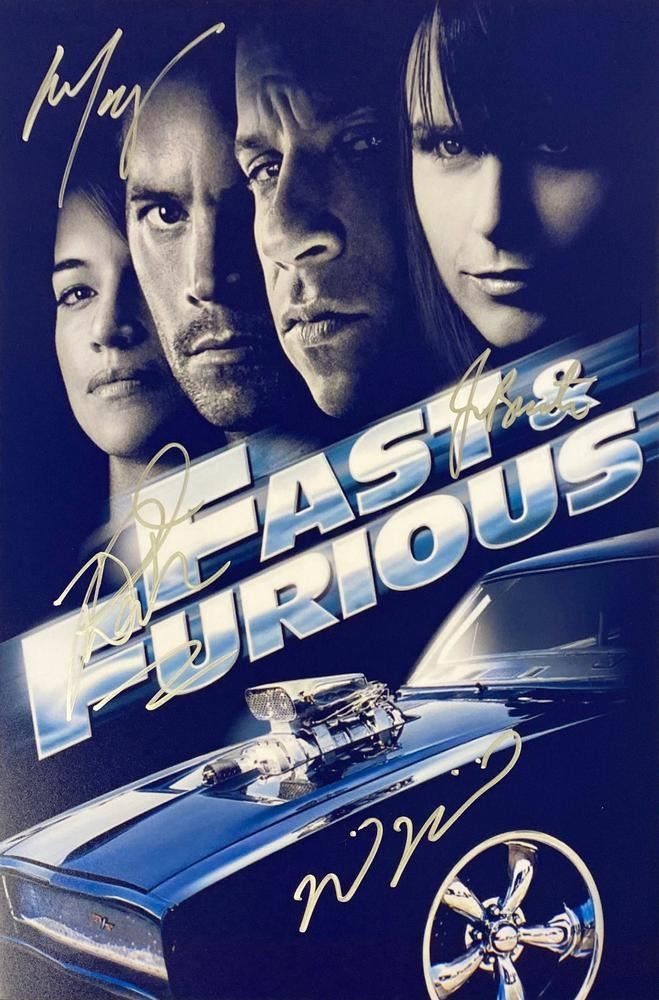 Fast & Furious cast facsimile signed movie photo autographed by Vin Diesel, Michelle Rodriguez, Paul Walker and Jordan Brewster. 8x10 inches. This item is a reprint of an original autograph