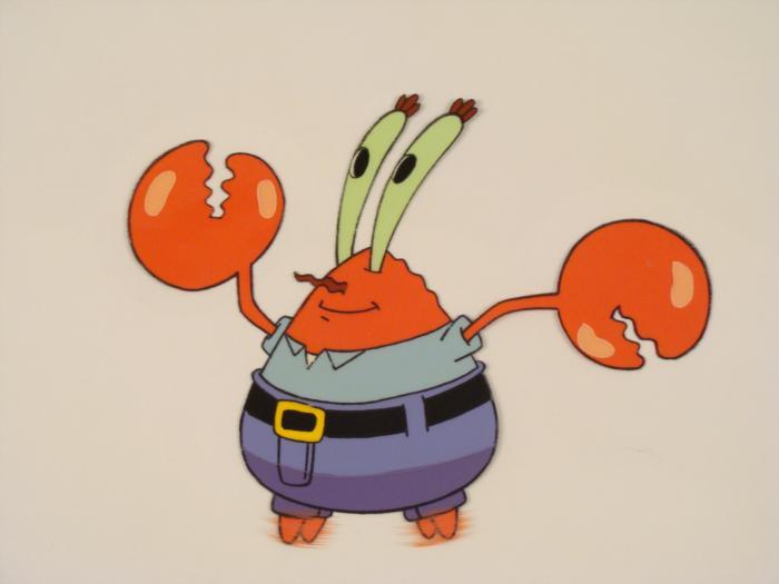 This original animation cel is from the Nickelodeon TV show SpongeBob Squarepants. The story takes place under the deep blue sea in Bikini Bottom, where SpongeBob resides. SpongeBob, who is a yellow, porous sponge, is your typical happy-go-lucky character, as he is always cheerful and enjoys making people laugh. Patrick Star, SpongeBob's neighbor who is a starfish, is your average children's show idiot, as he boasts knowing nothing and is often getting himself into ridiculous situations. Between the homes of these two lies the home of the miserable Squidward, a squid, who is known for being grouchy and playing tricks on SpongeBob and Patrick. Both SpongeBob and Squidward work at the Krusty Krab, a fast food business run by the greedy money-loving Mr. Krabs, a crab, the arch rival of the evil, possibly misunderstood, Plankton. Another neighbor, Sandy Cheeks, an athletic squirrel who normally wears an astronaut's space suit, was introduced in "Tea at the Treedome." She spends most of her time inventing and experimenting. Mr. Krabs is moving his legs fast.Original Production Animated Cel Overall Size of Cel: 10 1/2" x 12 1/2" Very Good ConditionThis is an original hand-painted cel set-up used in the production of an episode of "SpongeBob SquarePants." Each one-of-a-kind set-up represents a slight change in position of the characters. When individually photographed and projected in rapid succession, the images appear to move.