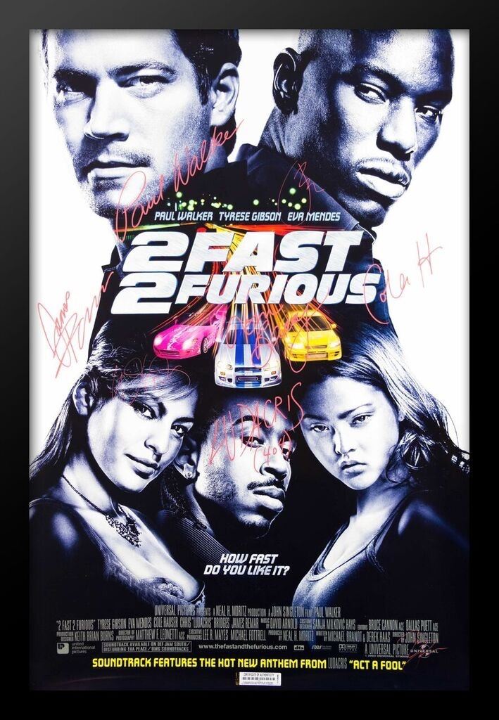 2 FAST 2 FURIOUS OFFICIAL POSTER SIGNED BY 7This poster has been autographed by: Paul Walker, Eva Mendes, Thom Barry, Cole Hauser, Paul Walker, James Remar, Ludacris, Tyrese GibsonAuthenticity. This item comes with a Certificate of Authenticity from a third party authenticator. This Certification of Authenticity does not imply that the item will be certified by any other rival authentication companies. The accompanied certification is the only certification the auction company can confirm. These items are being sold as collectable pieces and there is no guarantee that this item can be resold on any online marketplace. Each of these companies has their own policies and politics.