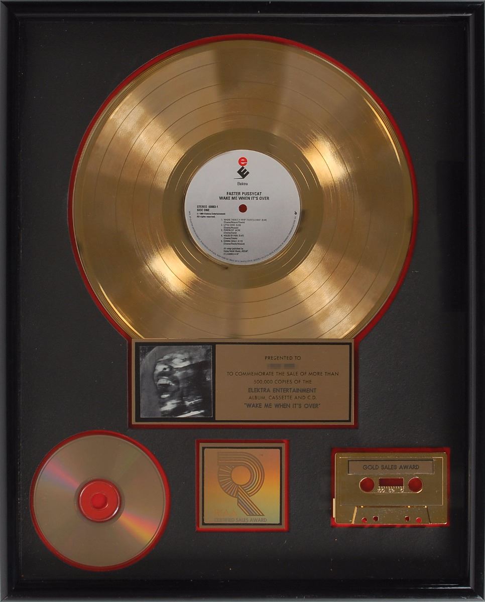 Official ‘R’ hologram-style RIAA gold sales award presented “to commemorate the sale of more than 500,000 copies of the Elektra Entertainment album, cassette and C.D. ‘Wake Me When It’s Over.’” Framed with its disc, CD, cassette, and plate bearing a small image of the album cover to an overall size of 16.75 x 21. Award retains its original backing. In fine condition.