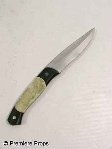 Straight from the set of Faster, this is a silver colored rubber shiny blade with worn rubber ivory and black handle knife. (approx. 10 1/2" long)