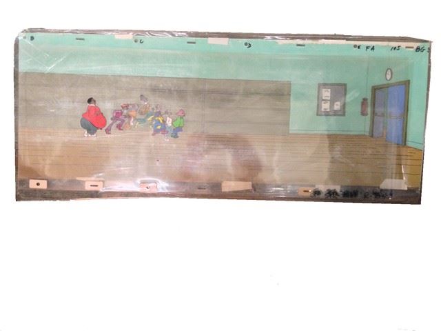 "Fat Albert" Animation Pan (featuring "Fat Albert" and the "Cosby Kids" running through the school gym / includes original hand painted background / 1972 / Filmation Studios / 30" x 10.5")