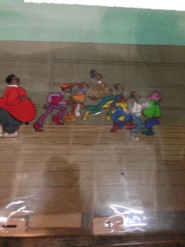 "Fat Albert" Animation Pan (featuring "Fat Albert" and the "Cosby Kids" running through the school gym / includes original hand painted background / 1972 / Filmation Studios / 30" x 10.5")