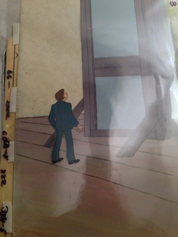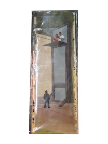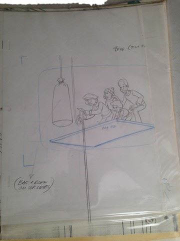"Fat Albert" Animation Cel (featuring "The Gang" / Filmation Studios / 1972 / Some of the gang stuck on a tall wooden stand lowering down with a bag and rope, this animation includes several sketches that go with it. (32x12)