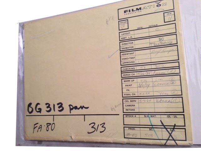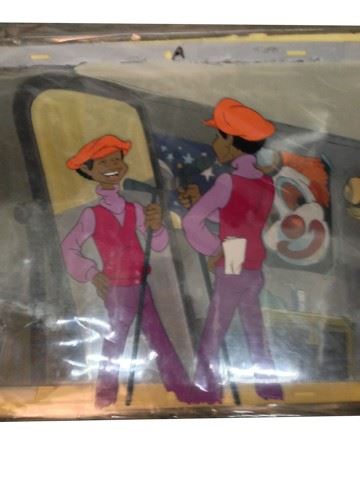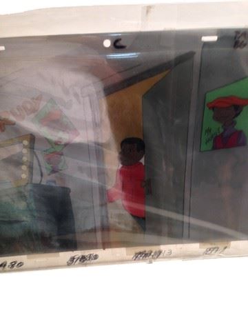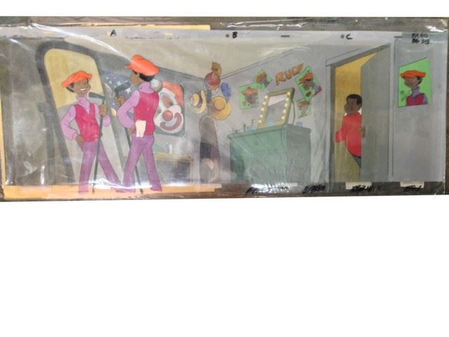 "Fat Albert" Animation Pan (featuring "Rudy" in his dressing room / includes original hand drawn character sketches / also includes original hand painted background / 1972 / Filmation Studios / 30.5" x 10.5")