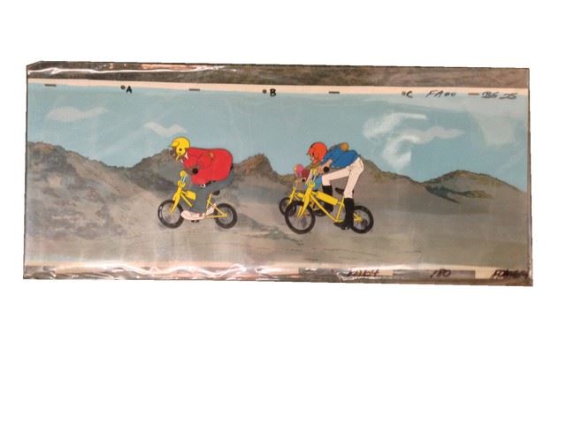 "Fat Albert" Animation Pan (featuring "Fat Albert" in a dirt bike race! / includes original hand painted background / 1972 / Filmation Studios / 28" x 10.5")