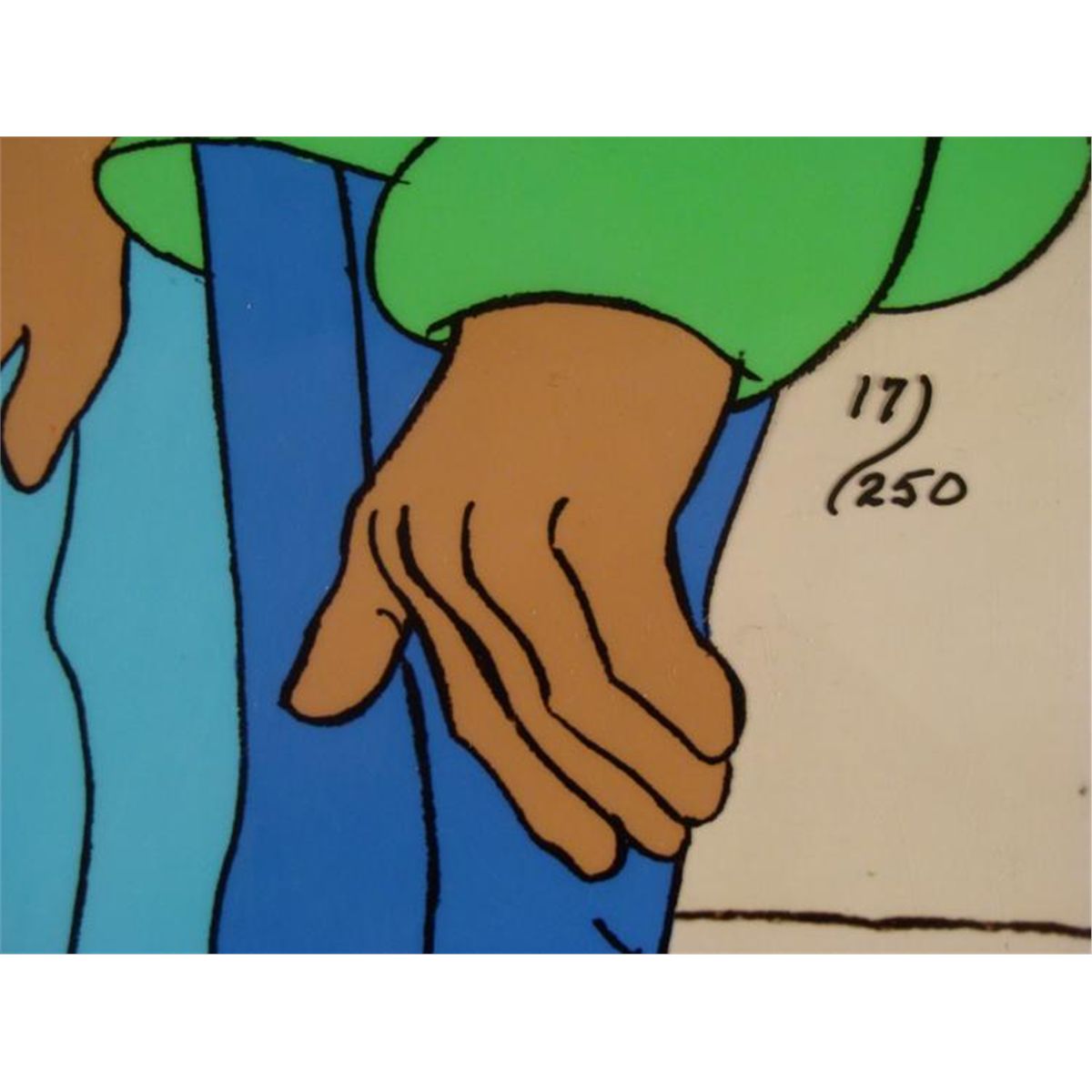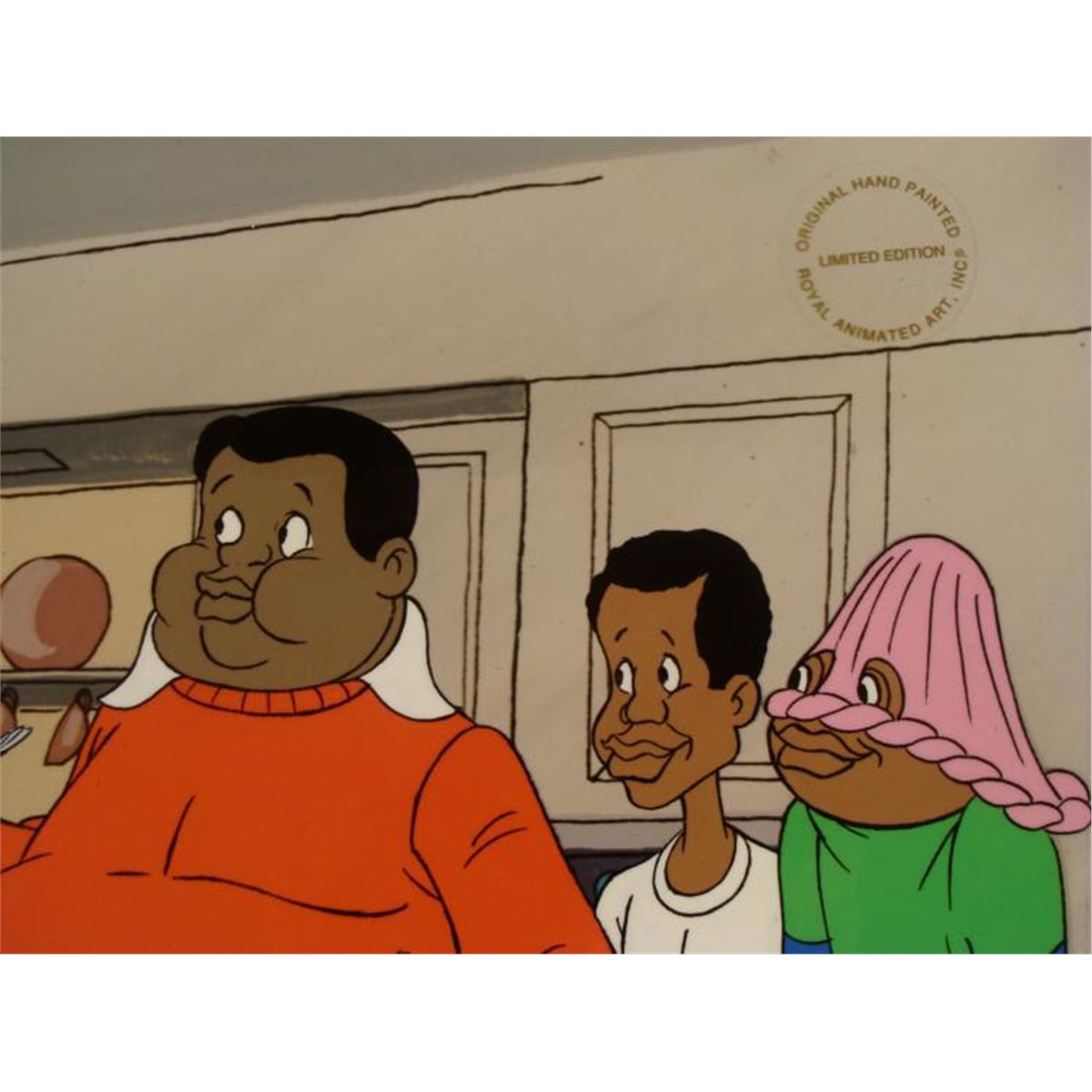 Hey Hey Hey--it's Fat Albert & Friends in a great hand painted animation cel! This scene finds them all in the kitchen ready to chow down, and Fat Albert's going all healthy with a big salad. * Medium: Hand painted cel acetate with printed backgroundEdition: 17/250Sheet size: 14 1/2 x 16 1/2 inchesPublisher: Royal Animated Art, Inc. (certification sticker, upper right)Condition: Excellent