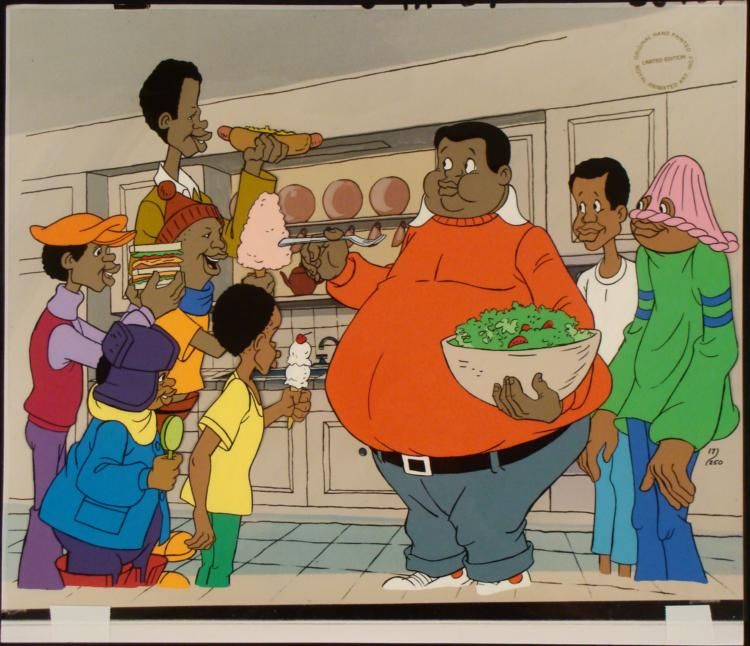 Hey Hey Hey--it's Fat Albert & Friends in a great hand painted animation cel! This scene finds them all in the kitchen ready to chow down, and Fat Albert's going all healthy with a big salad. * Medium: Hand painted cel acetate with printed backgroundEdition: 17/250Sheet size: 14 1/2 x 16 1/2 inchesPublisher: Royal Animated Art, Inc. (certification sticker, upper right)Condition: Excellent