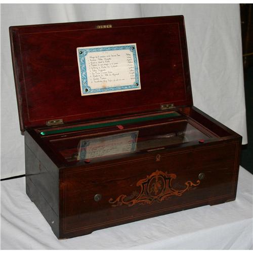 Cylinder Music Box with Fat Cylinders that measures approximately 13.25" long. Box has hidden drum and bells. No broken teeth. Tune card present. Side door conceals hole for winding. Plays. Attractive walnut case with inlay on front and top.