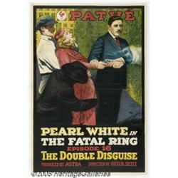 <B>Fatal Ring (Pathe', 1917)</B></I> One Sheet (27" X 41"). Episode 16, "The Double Disguise." Pearl White, famous serial star, was featured in this chapter-play three years after her work on "The Perils of Pauline." She is pictured on this poster with co-star Warner Oland, who would later go on to fame as Charlie Chan. This historic poster has been linen backed and prior to had all of the borders trimmed. There is much work on the borders and the image. The work done was not up to contemporary standards, but the colors are bright and still an exciting, early piece of film history. Good.