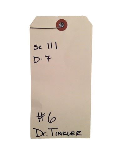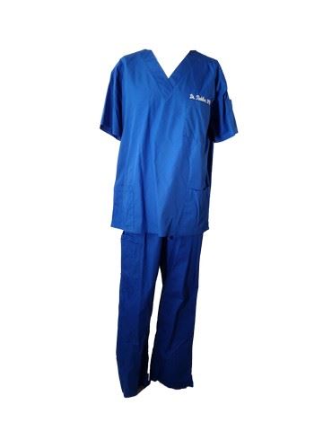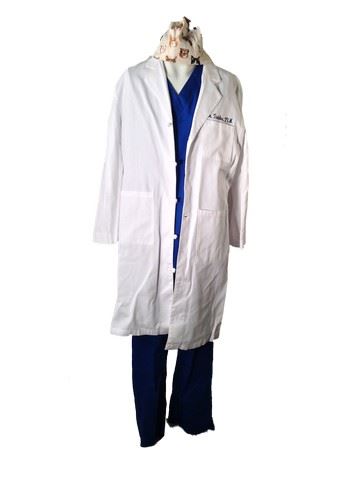 Dr. Tinkler (Christopher Walken) screen worn, white lab coat with black stitching on left breast above the pocket that reads Dr Tinkler DVM, royal blue srubs, scrub top is also stitched on left breast pocket, Dr. Tinkler DVM, kitty cat scrub cap, tan with cat head design. Wardrobe tag included. Used in scene 111.