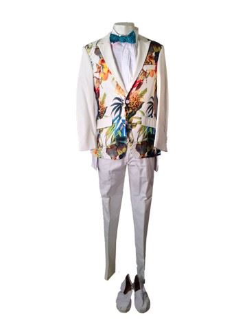 Kyle (Owen Wilson) screen worn, hero, off white "Angelino" suit coat made of artificial leather and is covered in front and back body of the jacket in a bright floral pattern(38), white tuxedo style "Brooks Brothers" dress shirt (15.5-34), two toned turquoise and red "Cinabre" bow tie, off white woven "Zara Man" pants, white "Toms" shoes with blue stitching(10.5). Worn in the wedding scene.