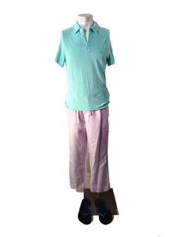 Kyle (Owen Wilson) screen worn, hero, teal "Vilebrequin" shirt (L), lilac linen "Tasso Elba Island" pants(32x32), teal and black "Locals" flip flops, with a black pen that the name local has been scratched out. Worn in scenes 101-113. Wardrobe tag included.