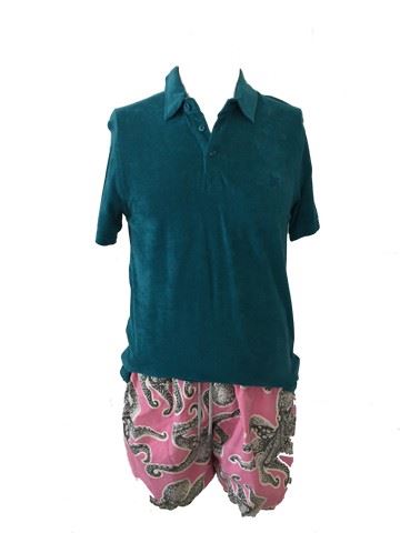 Kyle (Owen Wilson) screen worn, terry cloth "Vilebrequin" 3 button up polo (L), pink "Vilebrequin" swim trunks with grey octopus (xl). Worn in scene 4b. Wardrobe tag included.