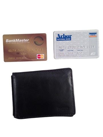 Peter (Ed Helms) screen used, hero, brown, "Fossil" leather wallet with two credit cards and two driver's licenses.(5x3).