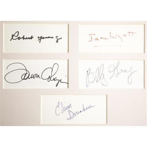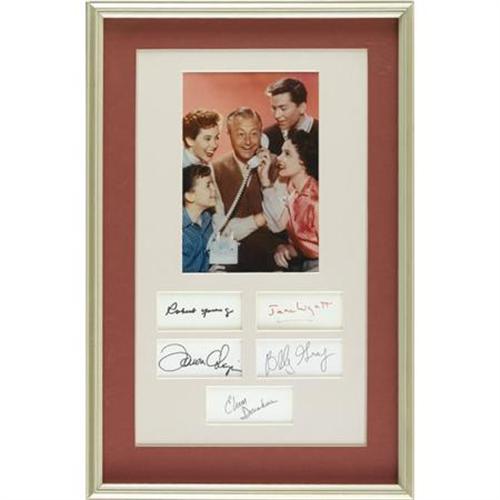 <B>"Father Knows Best" Cast Autograph Presentation.</B></I> A presentation of five individual <I>Father Knows Best</B></I> cast member autographs signed by Robert Young, Jane Wyatt, Billy Gray, Elinor Donahue, and Lauren Chapin. Framed in '50s colors in common with a color cast photograph. <I>Authenticated by the world's foremost curators of television artifacts, The Comisar Collection of Beverly Hills.</B></I><BR><BR><b>Shipping:</b> Clothing, Costumes & Jerseys (<a target="_blank" href="http://www.heritageauctions.com/common/shipping.php">view shipping information</a>)
