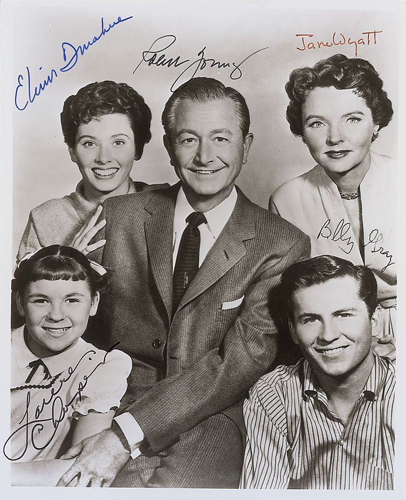 Glossy 8 x 10 cast photo of the Warren family, signed in various color felt tip by Robert Young, Jane Wyatt, Lauren Chapin, Elinor Donahue, and Billy Gray. In very fine condition.