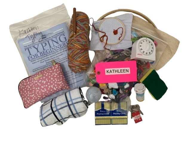 Jacki Weaver (Kathleen Long) scren used, hero bag of props. Includes yarn, several colors of string for needlepoint, a light bulb, a sponge, dish towel, needlepoint set, kitchen timer, fake prescription medicine, keys with a keychain, a pink dotted cosmetic bag, typing for beginners book, and 2 boxes of vintage playing cards.