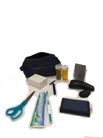 Stuart Long (Mark Wahlberg) screen used, hero, blue toiletry bag, includes various items such as, two pill bottles with pills (not real medication), deodorant, tooth brush and tooth paste, soap, scissors, shaver, and an empty bottle cologne. (5x7)