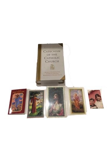 Stuart Long (Mark Wahlberg) screen used, hero, "Catechism of the Catholic Church" book, 3 laminated pictures of different prayers, ands a small picture of Stuart and his brother before his brother died. 1 pocket prayer book. (8"x5")