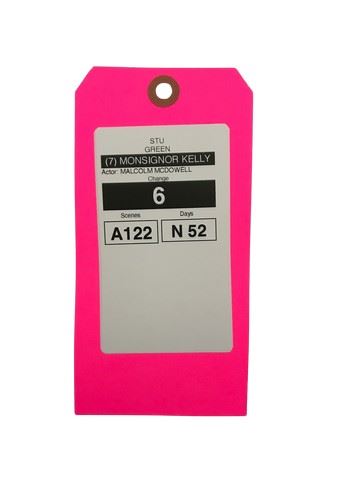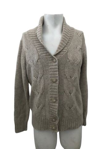 Monsignor Kelly (Malcolm McDowell) screen worn Eddie Bauer beige cabel knit sweater with lapel (large). Includes ccostume department wardrobe tag noting the scene # it was used for.