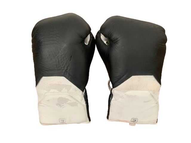 Opponent #3's screen used, hero black and white (unbranded) distressed from production boxing gloves (10 oz).