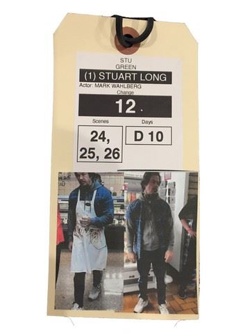 Stuart Long (Mark Wahlberg) screen worn, bloody apron, "Hanes", heathered gray zip hoodie (m), "Hanes" white t-shirt (m). Includes wardrobe tag. From the supermarket scene.