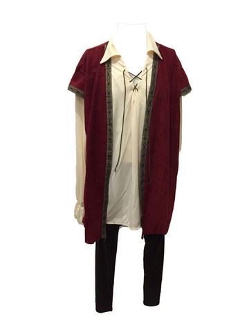 Stuart Long (Mark Wahlberg) screen worn, Medieval Man "California Costumes" costume with shoe buckles, a burgundy tunic vest with built in cream colored shirt with lacing and high waisted brown leggings and belt (Adult size 48-52). Includes wardrobe tag.