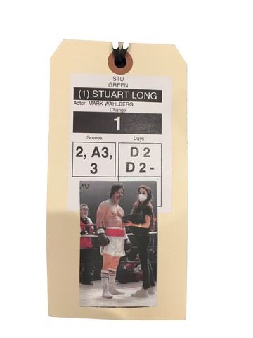 Stuart Long (Mark Wahlberg) screen worn, "Everlast", red/white/black, knee length boxing robe with white shawl collar, "MTO", white/red/blue boxing trunks, "Title", white boxing shoes (10), "Casanova" padded leather, white/black groin guard and white with red/blue striped socks. Includes wardrobe tag.