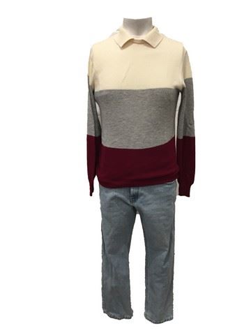 Stuart Long (Mark Wahlberg) screen worn, "Jansport" cream/grey/maroon acrylic, color block, collared sweater, "Hanes" white t shirt (m), and "Wrangler" jeans. Wardrobe tag included. Worn in the East LA church scene.