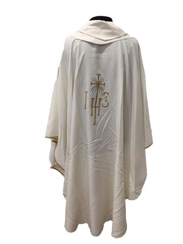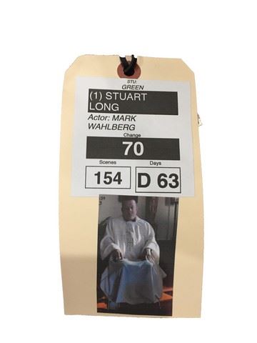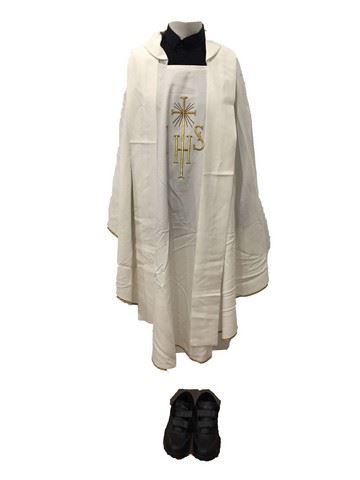 Stuart Long (Mark Wahlberg) screen worn, "Solivari", cream chasuble with gold embroidered IHS with cross on the center front and center back, cream stole, "RJ Toomey" black, seminary dress shirt (17) with seminary collar and black "AdTec" seminary, velcro, leather shoes (9.5). Includes wardrobe tag. From the Montana church nave scene.