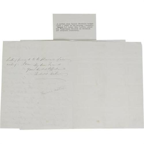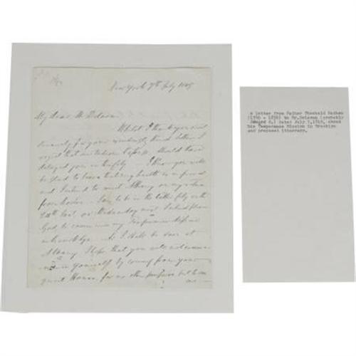 <B>Father Theobald Mathew Autograph Letter Signed,</B></I> 7 x 8.5, three pages, July 7, 1849, New York, from Mathew to Mr. Delavan. Folds else fine. <BR><BR>Theobald Mathew (1790-1856) was an Irish temperance reformer. He received his schooling in Kilkenny. From 1808 to 1814 he studied in Dublin, where in the latter year he was ordained to the priesthood and entered the Capuchin Order. The movement with which his name is associated began in 1838 with the establishment of the Abstinence Society which relied on one enduring act of will to keep a person sober for life. It was called simply The Pledge. It could be made by anybody, either with or without an alcohol problem. Father Mathew did not believe in gradual approaches or temporary commitments. He advocated a promise that meant complete commitment. It did not bind like the vows of marriage, but the principle of permanent commitment was the same. Fr. Mathew understood that as long as the act of will continued, it could overcome all difficulties. At its height just before the Great Famine of 1845-48, his movement enrolled some 3 million people, or more than half of the adult population of Ireland. In 1844 he visited Liverpool, Manchester, and London with almost equal success. <BR><BR>On July 2, 1849 New York welcomed Fr. Mathew. Mayor Woodhull, a non-Catholic, placed City Hall at his disposal. For two weeks the crowds besieging its chambers practically eliminated all city business. Vice-President Millard Fillmore was one of the callers. In Washington President Zachary Taylor invited Fr. Mathew to dine at the White House. Congress gave the humble Capuchin friar its highest honors. The House unanimously admitted him to a seat on the floor of the House. The Senate admitted him within the bar of the Senate, an honor given previously only to Lafayette. <BR><BR>Edward Cornelius Delavan (1793-1871) was an antiliquor leader and one of the two dozen wealthiest New Yorkers. <B></B></I><BR><BR><b>Shipping:</b> Flat Material, Small (<a target="_blank" href="http://www.heritageauctions.com/common/shipping.php">view shipping information</a>)
