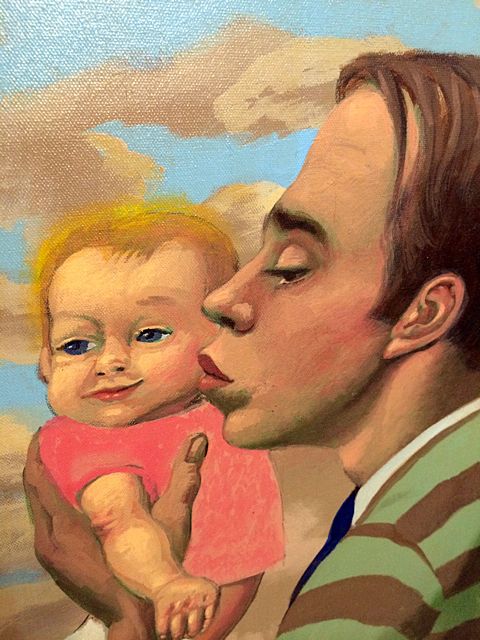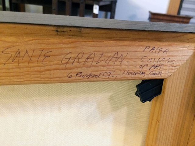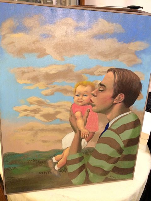 Beautiful painting of father holding child. Signed by Artist Sante Graziani. Would make a great Father's Day gift!!! Sante Graziani (1920–2005) was an American artist and art educator. He was known for his murals, which adorned many public buildings. Graziani was educated at the Cleveland Institute of Art and later at Yale University. He met with success early in his career, winning the Pulitzer Traveling Scholarship in Art at the age of 22. Soon after military service in World War II, he began a career as an art educator. He taught at Yale University School of Art from 1946 to 1951. Graziani initially gained recognition for his murals. Among his works were a mural at the Holyoke (Mass.) Public Library and one at the Museum of Fine Arts in Springfield, Massachusetts. In the years around the United States bicentennial celebration in 1976, he produced paintings that included references to well known images of George and Martha Washington. He was commissioned to paint a colorful and decorative mural featuring an image of George Washington on the side of a building in Worcester, Massachusetts, in that era.